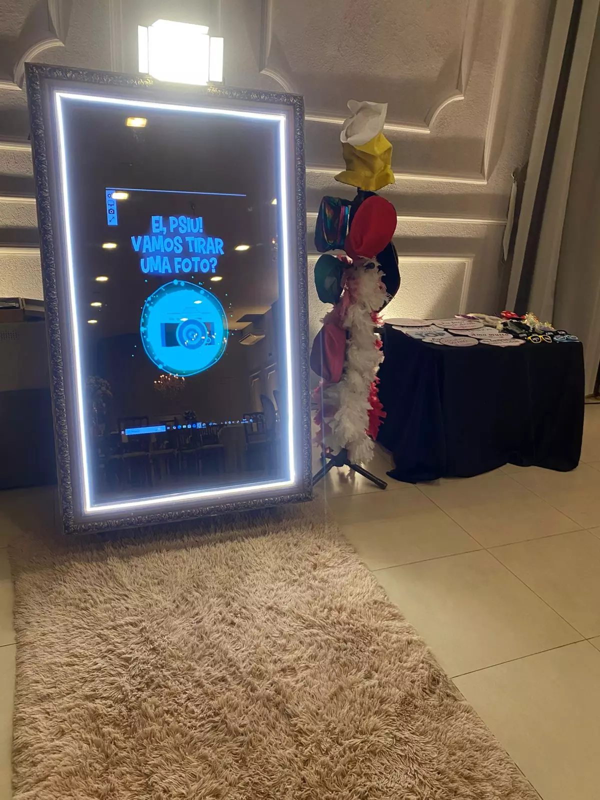 O Espelho Mágico é uma versão moderna da cabine de fotos, oferecendo uma experiência interativa com animações, efeitos visuais e fotos de alta qualidade. Ao se aproximar, o convidado recebe orientações para poses criativas e a foto é impressa instantaneamente. Seu design sofisticado adiciona um toque de elegância e modernidade ao evento, proporcionando uma experiência inesquecível.